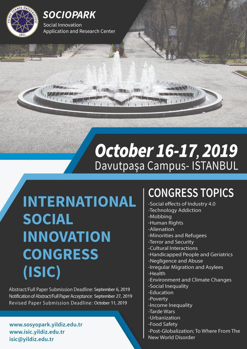 International Social Innovation Congress in Turkey will be held in 16-17 October 2019 at Yildiz Technical University Social Innovation Application and Research Center-SocioPark with hosted Davutpaşa Campus.